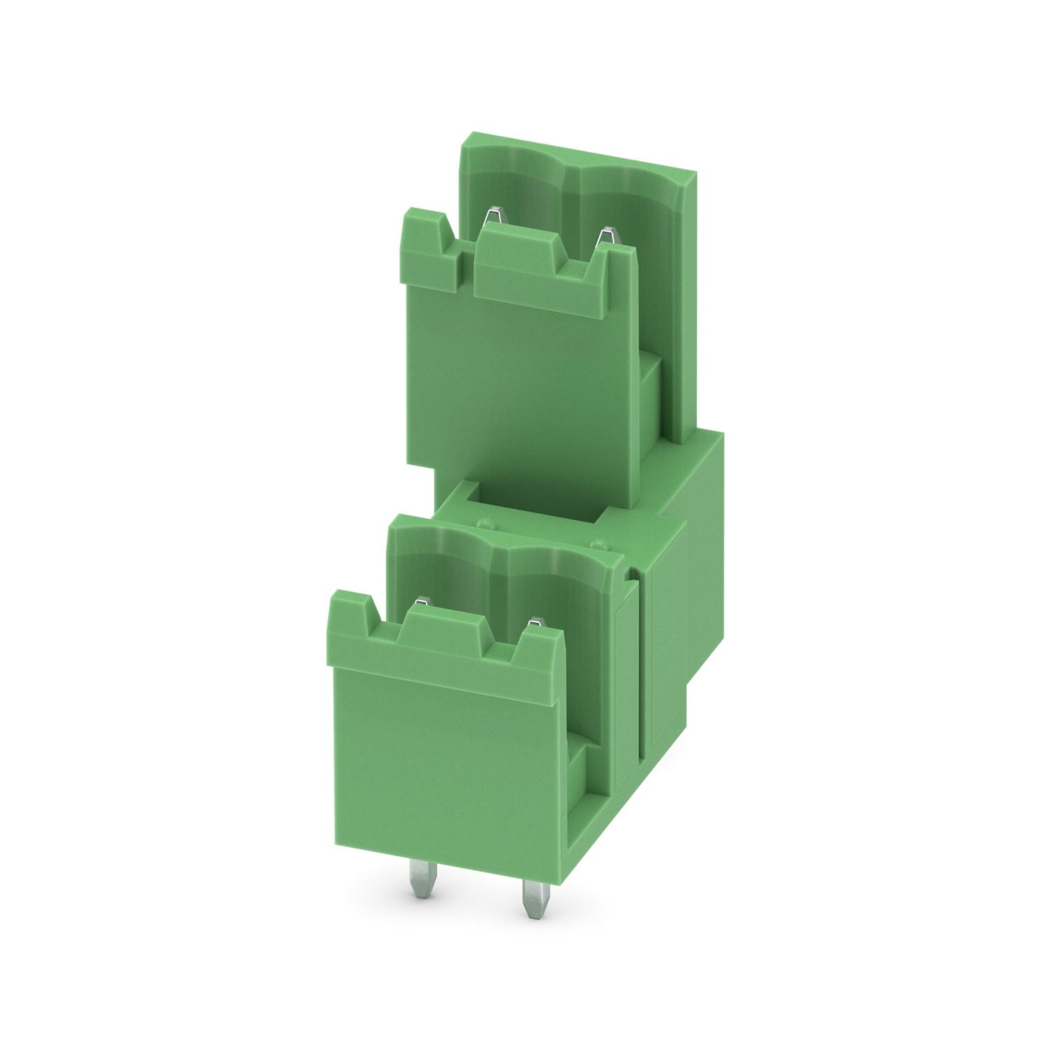 PCB headers, nominal cross section: 2.5 mm2, color: green, nominal current: 10 A, rated voltage (III/2): 320 V, contact surface: Sn, contact connection type: Pin, number of potentials: 4, number of rows: 2, number of positions: 2, number of connections: 4, product range: MDSTBV 2,5/..-G, pitch: 5.08 mm, mounting: Wave soldering, pin layout: Linear pinning, solder pin [P]: 3.9 mm, number of solder pins per potential: 1, plug-in system: COMBICON MSTB 2,5, Pin connector pattern alignment: Standard, locking: without, mounting method: without, type of packaging: packed in cardboard, Can be aligned! Mounting flange: Item No. 1836477, 1836480. In combination with MVSTB or FKCV plug components, both an MVSTBW (or FKCVW) and an MVSTBR plug (or FKCVR) must be used. Combination with TMSTBP plug components is not possible!
