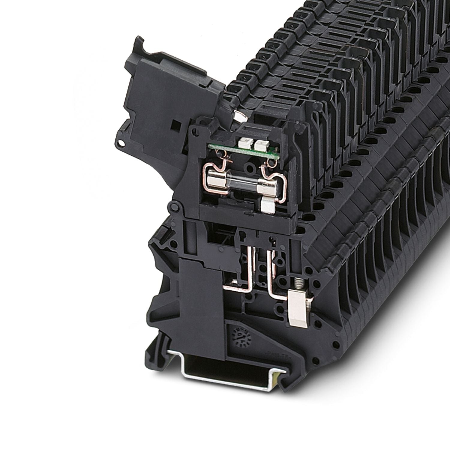 Fuse modular terminal block, fuse type: Glass / ceramics / ..., fuse type: G / 5 x 20, nom. voltage: 24 V, nominal current: 6.3 A, connection method: Screw connection, Rated cross section: 4 mm2, cross section: 0.14 mm2- 6 mm2, mounting type: NS 35/7,5, NS 35/15, color: black