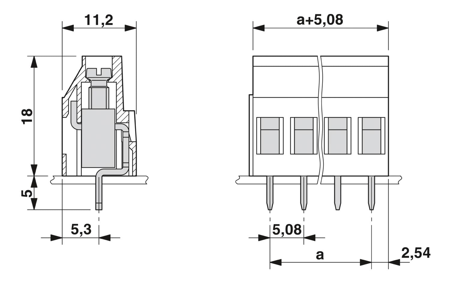 Printed circuit board terminal, nominal current: 24 A, rated voltage (III/2): 400 V, nominal cross section: 2.5 mm2, number of potentials: 2, number of rows: 1, number of positions per row: 2, product range: MKDS 3, pitch: 5.08 mm, connection method: Screw connection with tension sleeve, screw head form: L Slotted, mounting: Wave soldering, conductor/PCB connection direction: 0 °, color: green, Pin layout: Linear pinning, Solder pin [P]: 5 mm, number of solder pins per potential: 1, type of packaging: packed in cardboard. The article can be aligned to create different nos. of positions!