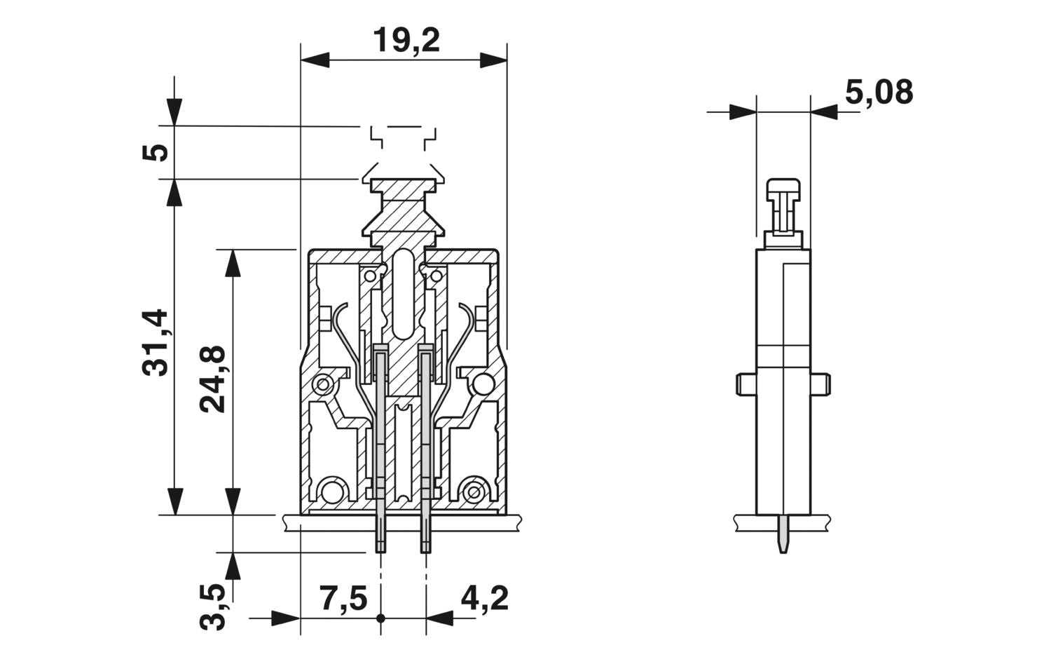 Printed circuit board terminal, nominal current: 12 A, rated voltage (III/2): 320 V, nominal cross section: 0 mm2, number of potentials: 1, number of rows: 1, number of positions per row: 1, product range: PTS, pitch: 5.08 mm, mounting: Wave soldering, color: green, Pin layout: Linear pinning, Solder pin [P]: 3.5 mm, number of solder pins per potential: 2, type of packaging: packed in cardboard. The article can be aligned to create different nos. of positions!